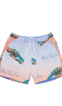 Bañador de nailon reciclado con estampado integral, bolsillos laterales inclinados y bolsillo con velcro en la parte posterior con remache de metal.