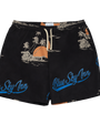 Recycled Nylon all over printed swim trunks with slant side pockets and velcro pocket on back with metal rivet